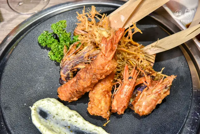 一整隻的海老使用伊比利豬與鳳梨片包覆著蝦子炸到金黃酥脆,吃的到蝦子的香氣及外層麵衣的酥脆,就連蝦頭也可以吃唷!一旁還有炸牛蒡絲和茄子,炸牛蒡的口感特別酥脆,茄子則有著酥酥軟軟,不過略顯油膩。