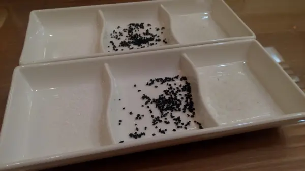 喝完湯,美人來上鹽盤,由左至右(醎度)是:玫瑰鹽(一般)、夏威夷黑鹽(淡)、松露鹽(最醎)。