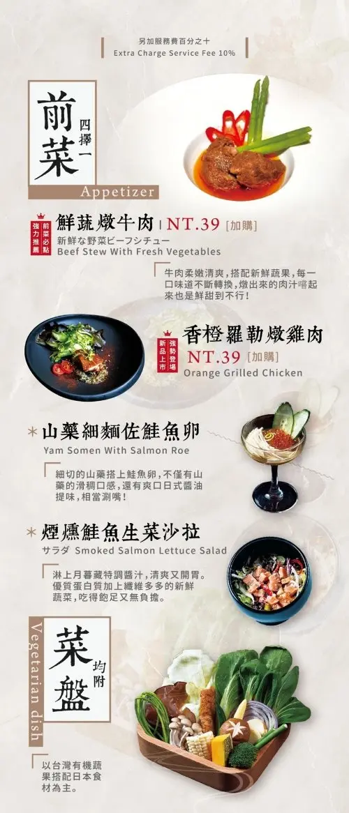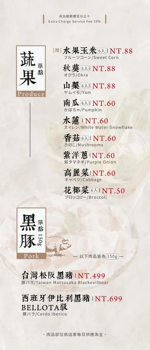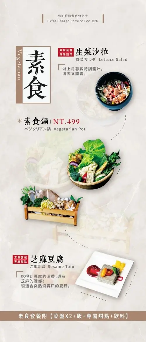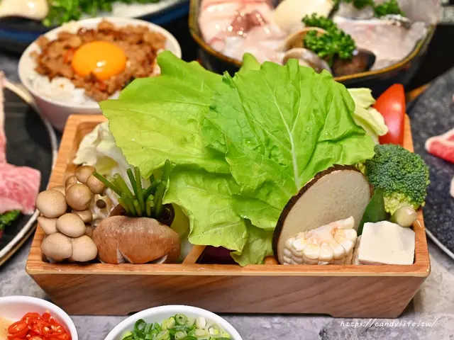 月暮藏涮涮鍋的蔬菜盤主要以台灣蔬菜及日本食材為主,裡頭有高麗菜、紫洋蔥、水果玉米、木耳、水蓮、香菇、鴻禧菇、山藥、南瓜、秋葵、青花菜等,菜色非常豐富