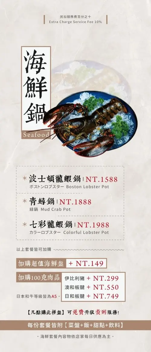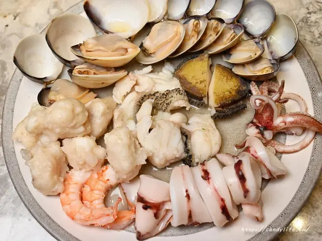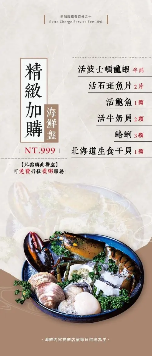 只要點鍋,即可加價超值海鮮拼盤,裡頭包含活白蝦、活石斑魚片、活九孔鮑、生鮮花枝漿、生鮮透抽、蛤蜊及活牛奶貝,七種海鮮只要399元真的物超所值阿
