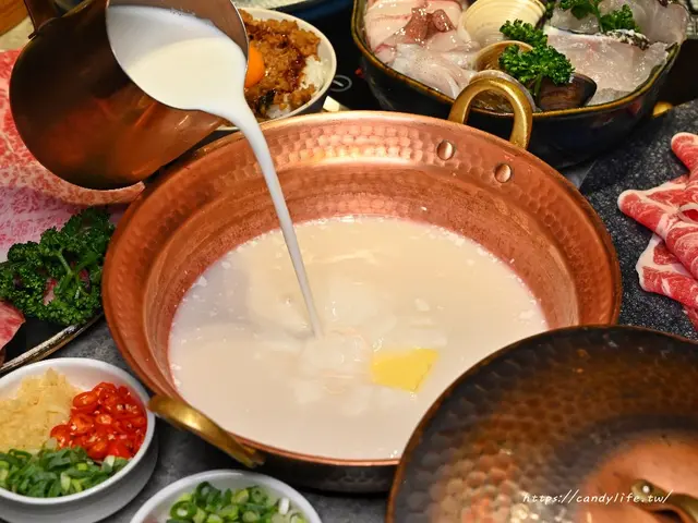 另一鍋湯底糖糖選了雪白的牛奶湯,使用多種蔬菜,搭配大骨下去熬煮,最後加入每日直送鮮乳及奶油塊,湯頭濃郁,奶香十足,糖糖還蠻愛月暮藏涮涮鍋的牛奶湯底