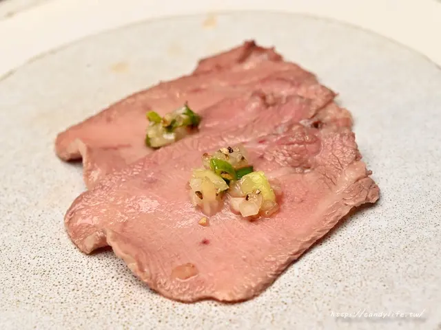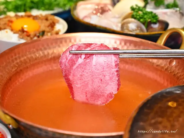 一般牛舌都是在燒烤店吃到,糖糖很少在火鍋店吃到牛舌,月暮藏涮涮鍋的牛舌是採用澳洲和牛牛舌,厚薄度切得剛剛好,大概涮至七分熟,搭配旁邊附上的鹽蔥醬,肉質Q彈,香氣十足