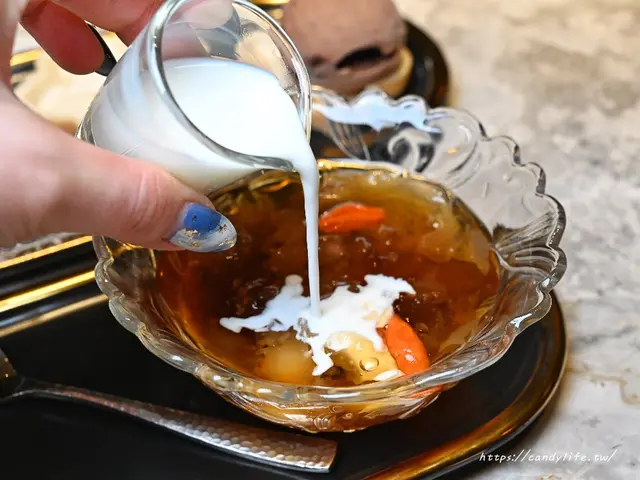 糖糖最愛的甜湯桃膠雪耳燉奶,別看他小小一碗,裡頭的配料可豐富了,除了桃膠,還有銀耳、蓮子、紅棗、枸杞及桂圓,旁邊附上鮮奶可以依自己喜好做搭配,口感滑順古溜,甜而不膩,好吃