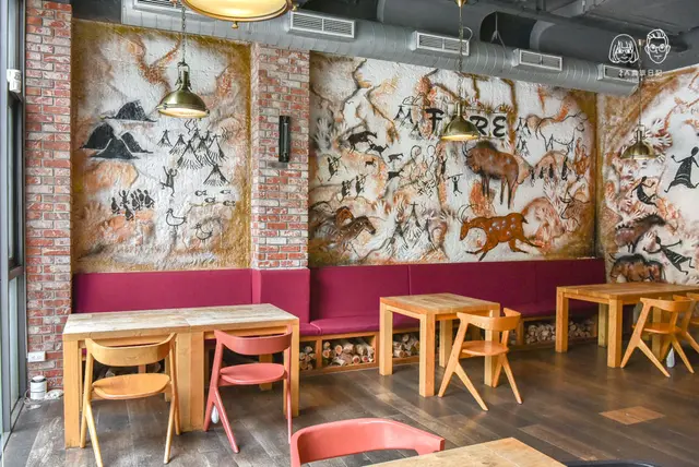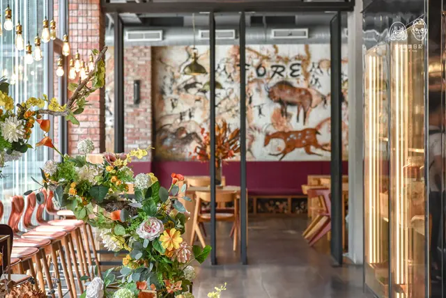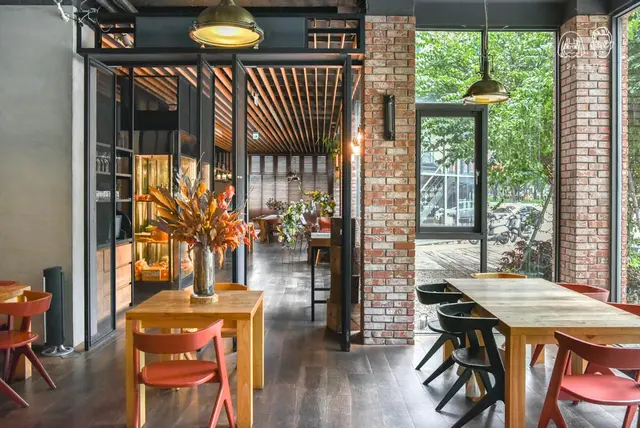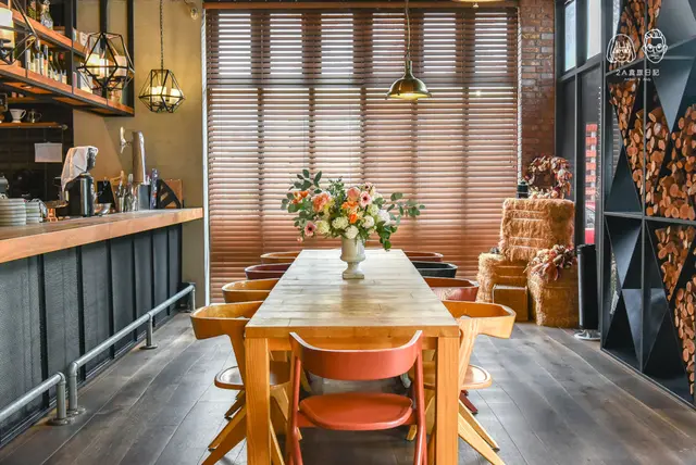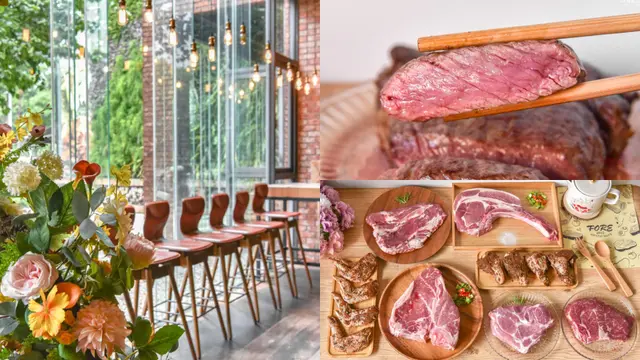 「柴燒牛排FORE restaurant」裝潢以紅磚作為主軸,並搭配透明落地窗、燈泡及仿真花的點綴,有著現代美式鄉村的清新自然氛圍。