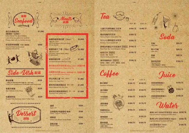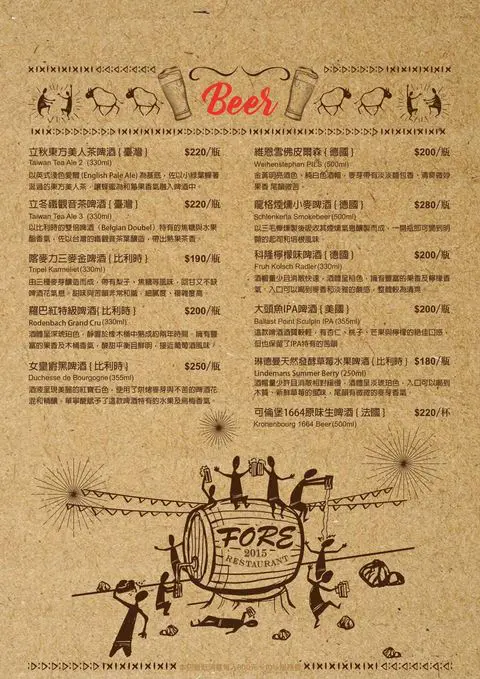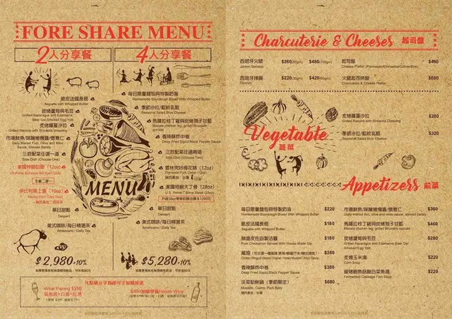 「柴燒牛排FORE restaurant」菜單提供了,2人分享餐、4人分享餐、肉類排餐、海鮮排餐、起司盤、前菜、蔬菜、甜點、啤酒、茶飲等,來這裡必點的當然是他們的牛排囉!若不吃牛,他們的豬肉也非常優秀!