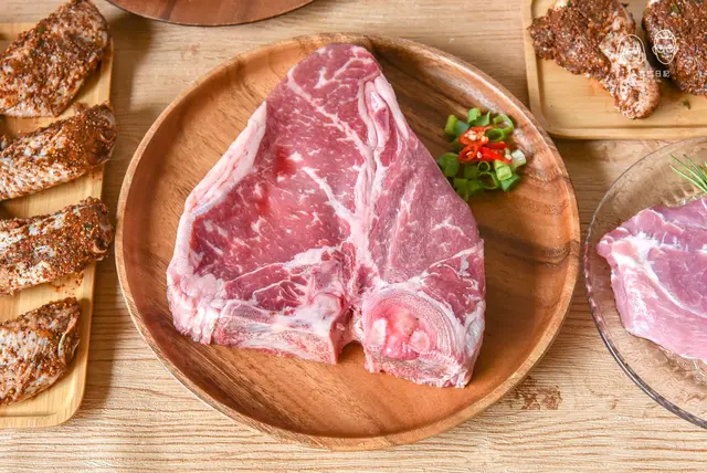 選用美國Prime等級的「特級丁骨牛排」份量非常浮誇,牛排有高達28oz的大小,基本上是適合3~4人享用的!「特級丁骨牛排」的料理方式比較特別,先在側邊油質部位用刀劃菱形紋路,再將側邊油質煎到金黃酥脆,接著牛排兩面各煎45秒,並在骨頭部位稍微按壓,然後起鍋將牛排靜置4分鐘,再放進180度c的烤箱烤3分鐘後於室溫靜置4分鐘(此步驟重複兩次),最後想來點不一樣的,可以在平底鍋加點奶油將丁骨牛排煎到兩面金黃即可享用。