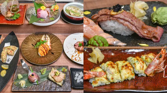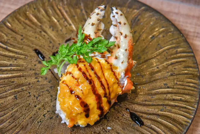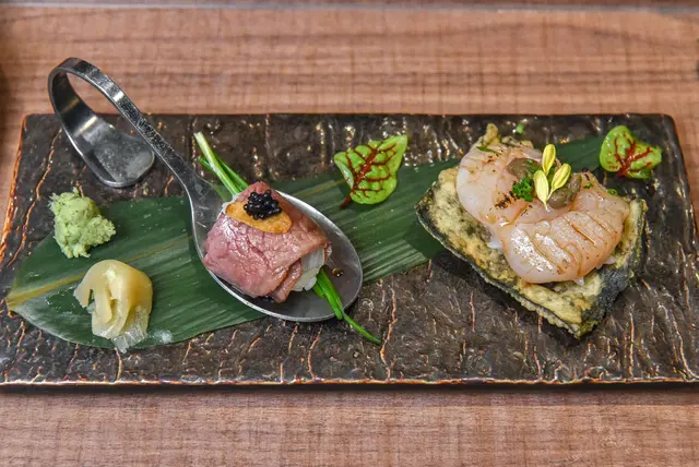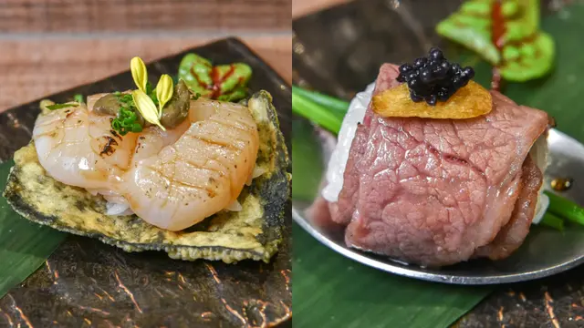 干貝炙燒握壽司底下是炸到酥脆的海苔,加上軟嫩的干貝和蟹膏,鮮味滿滿之外,還有著富的口感,安格斯牛小排炙燒握壽司以炸蒜片及魚子醬來點綴,軟嫩的牛小排肉香濃郁,細細咀嚼可以感受到肉香在嘴裡蔓延開來。