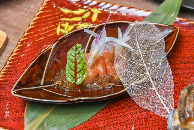 前菜:鮭魚梅酒晶凍、蟹肉水雲醋、磯煮鮑魚