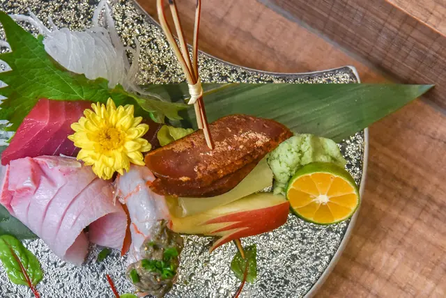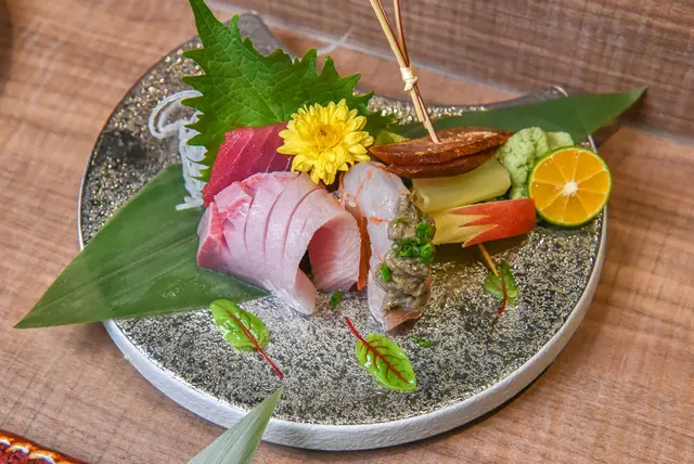 今天的刺身是,鮪魚、青甘、牡丹蝦、烏魚子,會以當季食材來製作。