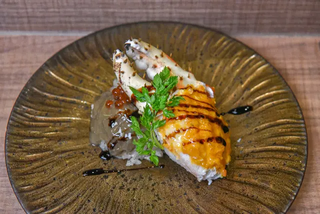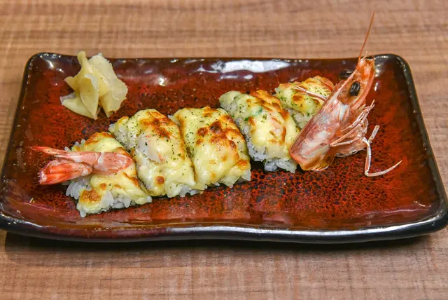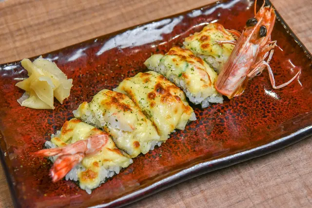 明蝦焗烤pizza壽司是桀壽司的招牌創意料理,海苔鋪在最底下,再蓋上醋飯、明蝦、小黃瓜,最後撒上起司焗烤完成。