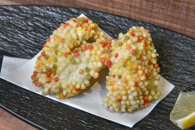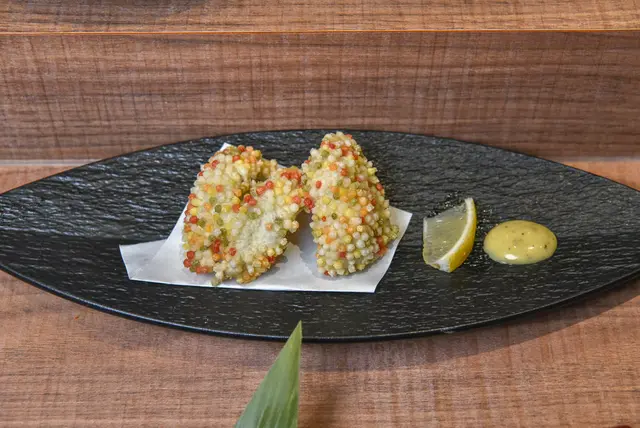 肉質細緻且多汁的黑鱈,裹上滿滿米果有著外脆內嫩的豐富口感,沾點蜂蜜芥末醬提味更鮮甜。