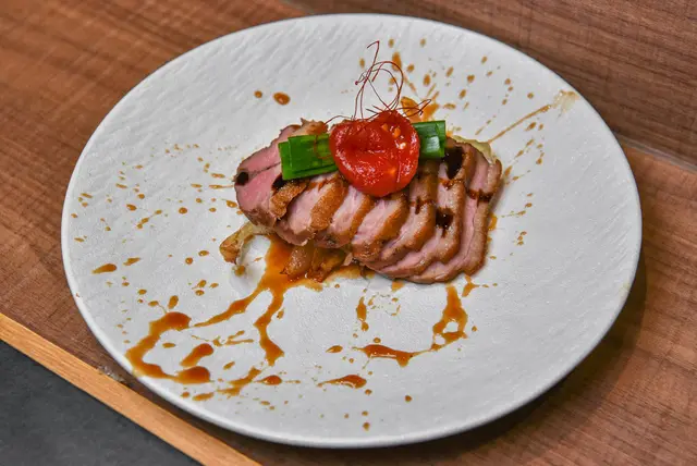 舒肥處理的櫻桃鴨充滿鴨肉質扎實有彈性,並帶點咀嚼感,但一點也不難咬,加上鴨皮的油脂使鴨香更濃郁。