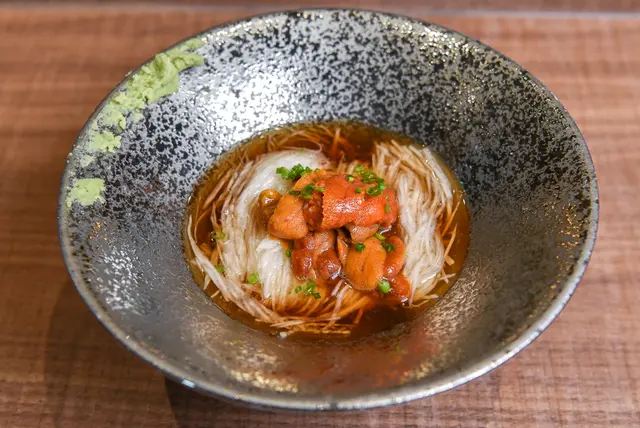山藥切成麵線的粗細度,搭配新鮮的馬糞海膽非常滑嫩,再加點芥末攪拌一下,那微微的嗆辣感讓美味再升級,這道我們超愛~