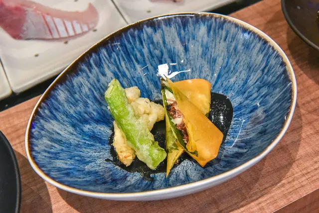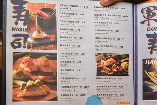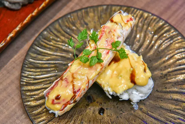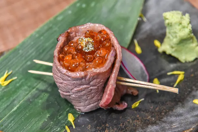 炙燒過的安格斯牛小排炙燒握壽司,使用鮭魚卵作點綴,加上金箔看起來更奢華!軟嫩的牛小排肉香濃厚,加上不不手軟的鮭魚卵多了份海洋鮮味。