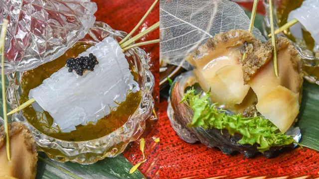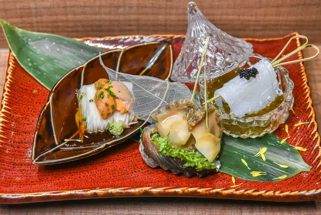 前菜:軟絲水雲醋、磯煮鮑魚、馬糞海膽山藥細麵