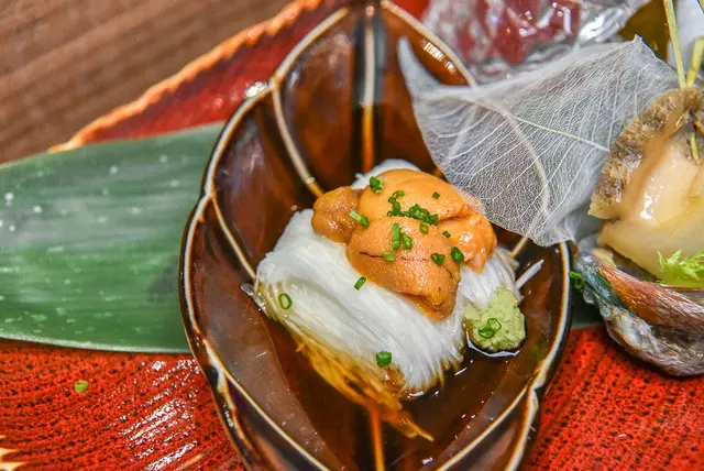 馬糞海膽山藥細麵,是將山藥切成麵線的細度,再搭配新鮮的馬糞海膽,吃起來香甜滑潤,還吃得到山藥脆脆黏黏的獨特口感,加上嗆辣的芥末令人回味無窮。