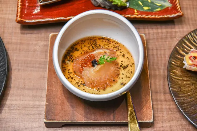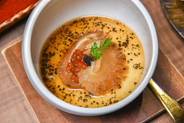 魚翅玉子生有一整塊魚翅,上面再以鮭魚卵和魚子醬點綴,搭配軟綿綿的蒸蛋,口感豐富且鮮味十足,還吃得到松露呢!