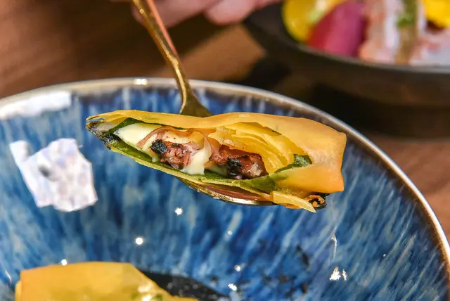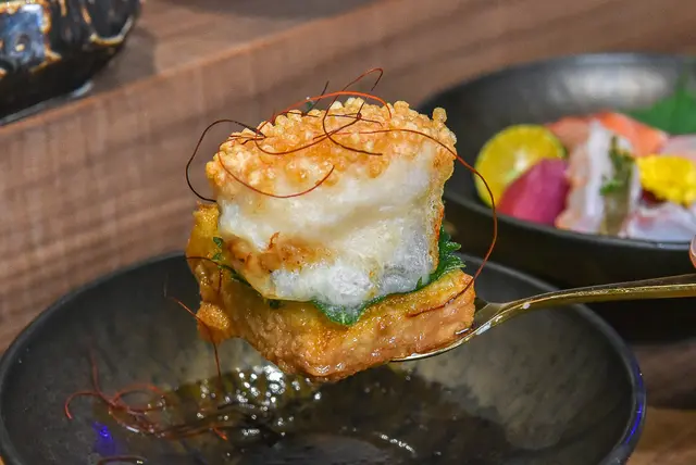 銀烏賊佐墨魚醬是以炸春捲皮加入銀烏賊來製作,吃起來外脆內扎實!