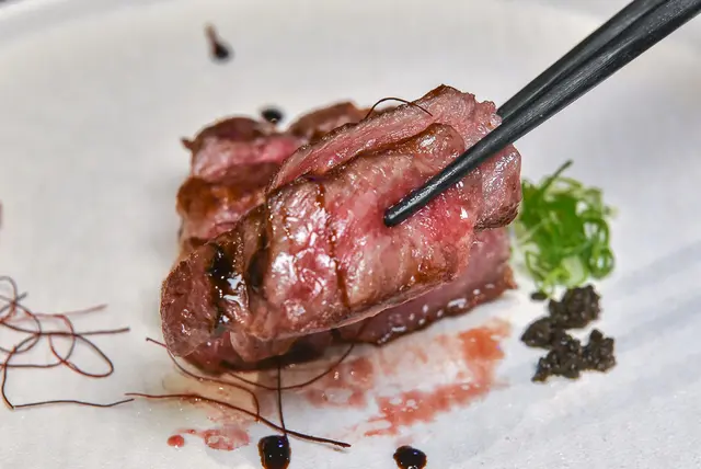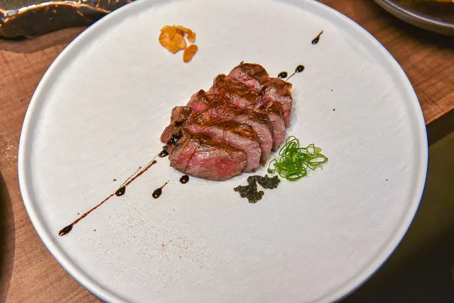 日本和牛選用紐約客這個部位,牛排烤到七分熟,中心保有粉嫩的色澤,肉質很是軟嫩,並保有濃郁肉香的豐沛肉汁,搭配松露醬或是蒜片都很有層次,或是沾點海鹽更帶出牛肉的鮮甜。