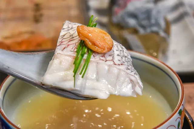 日本真鯛下巴份量也很有誠意,口味淡雅的真鯛下巴,肉質細緻柔軟之外,還有著甘甜滋味,搭配蒜味湯頭,讓人一口接著一口。