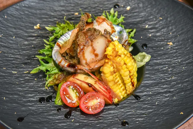 磯煮鮑魚沙拉有一整顆的大鮑魚,鮮甜彈牙的鮑魚加上爽口的新鮮蔬果,真的很開胃!