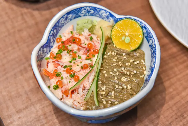蟹肉蟹膏丼可以一次吃到蟹膏和蟹肉,蟹膏質地非常濃醇厚實,一入口就感受到濃烈的蟹膏香直衝腦門,爽度爆表!而蟹肉口感細緻,加上鮭魚卵真的很鮮!