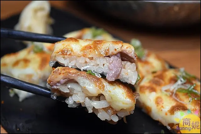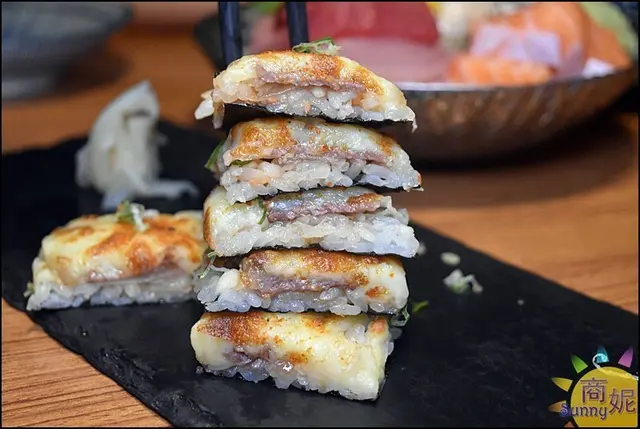 這道披薩是創意壽司,牛小排碳烤後,上下鋪滿起司及壽司飯,堆疊起來也是很吸睛。