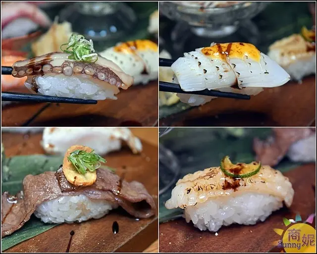 安格斯牛小排握壽司 牛小排炙燒後逼出油脂甜味,口感軟嫩味道特別甜,加上蒜片提味更好吃。