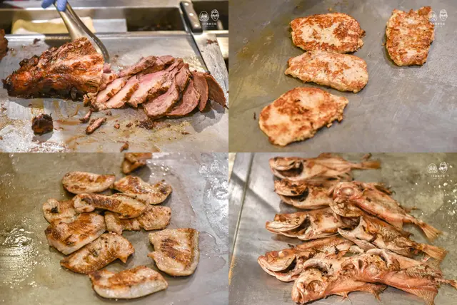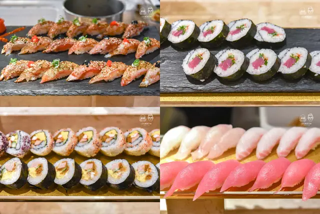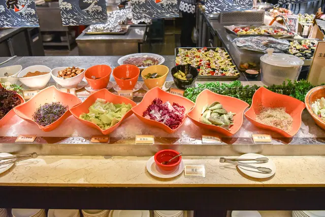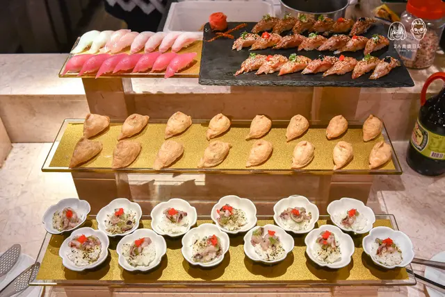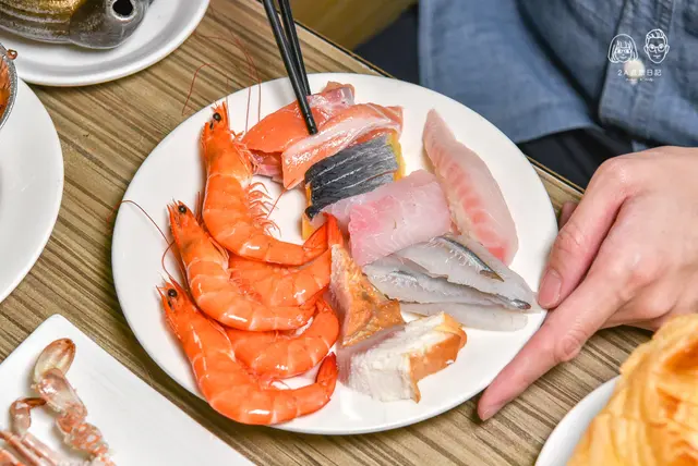 生魚片有鮭魚、旗魚、黃金鍊魚、鯛魚、水針、鯊魚煙這六種,生魚片是大家最快拿光的食物,所以愛吃生魚片的要先來排隊!