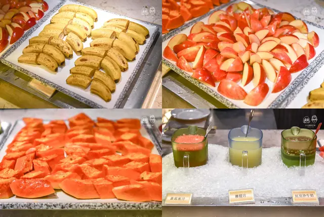 水果有香蕉、蘋果、木瓜、西瓜這四種以外,還有新鮮現打的番茄蜜汁、柳橙汁、紅豆沙牛奶。