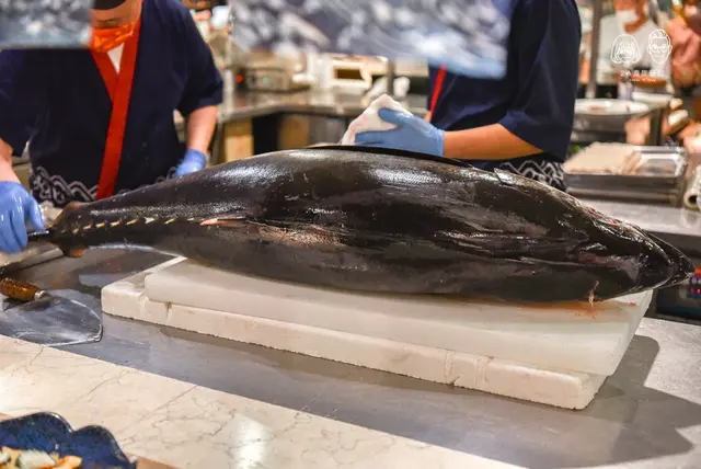 現宰鮪魚只有假日才有,在開始前餐廳會廣播通知,讓大家可以觀看師傅處理鮪魚的過程,每隻鮪魚大概重達40公斤左右,在當天中午時段會現宰一隻。