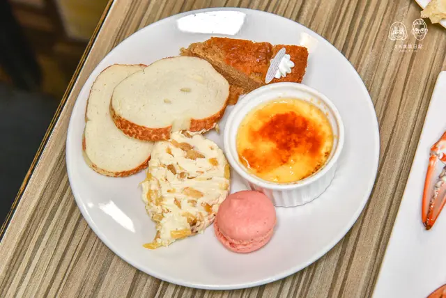 有一道我自己滿喜歡的,就是鳳梨起司,起司拌入土鳳梨,使起司充份吸收土鳳梨的酸甜及果香,鳳梨起司抹在脆脆的麵包上頭,儼然成為一道甜點呢!而「太陽百匯」必吃的甜點還有馬卡龍、磅蛋糕及烤布蕾,我們最喜歡外脆內綿密的烤布蕾~這也是最快被大家拿完的甜點。