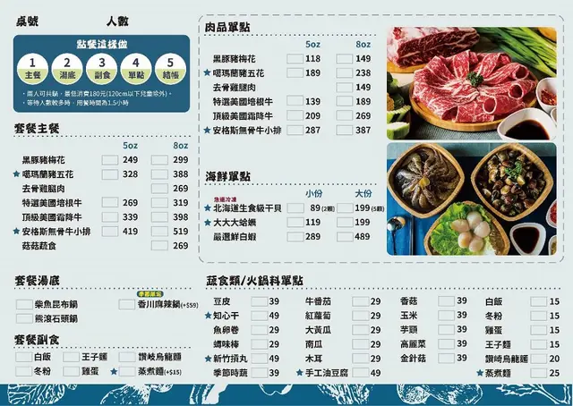 這邊附上menu給大家參考,熊滾有鍋最低鍋物只要249元起,兩人可共鍋,最低消費180元,首先選擇自己想要的主餐,肉品有5oz及8oz可以選擇,接著選湯底,有柴魚昆布鍋、熊滾石頭鍋及香川麻辣鍋(+59元)三種,最後再選擇想要的副食