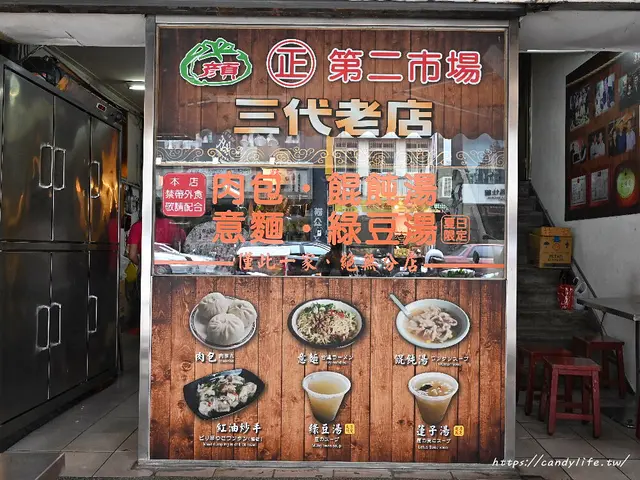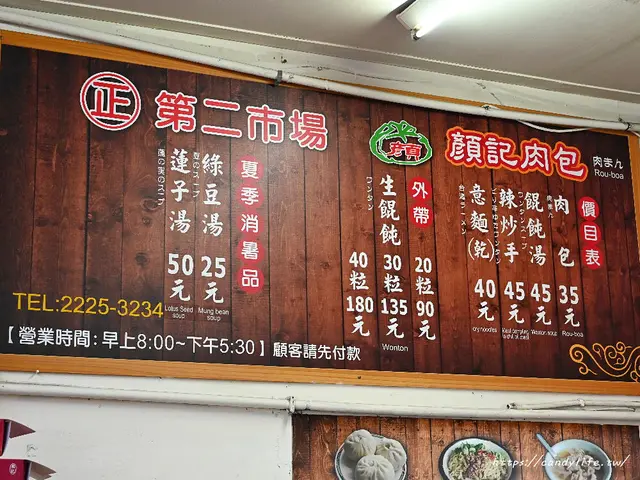 第二市場顏記肉包、餛飩湯已傳承第三代,僅此一間無分店,販售的品項不多,只有肉包、餛飩湯、紅油炒手、意麵、綠豆湯及蓮子湯,甜湯部分都是夏季限定,只有夏天才有賣