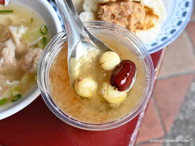 除了鹹食肉包、餛飩湯及意麵,顏記也有販售消暑的綠豆湯及蓮子湯,夏季限定販售,蓮子湯是用杯子盛裝,裡頭滿滿的白木耳,搭配蓮子及紅棗,口感滑嫩,甜度雖固定,吃起來不會讓人覺得甜膩,喝完很清爽