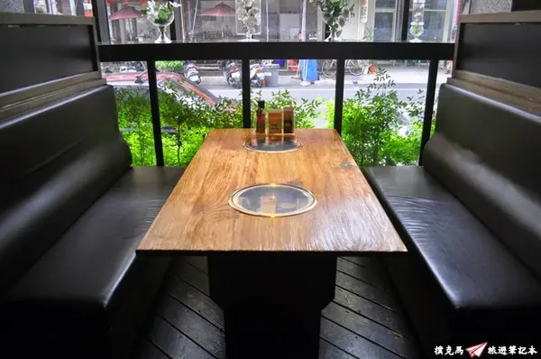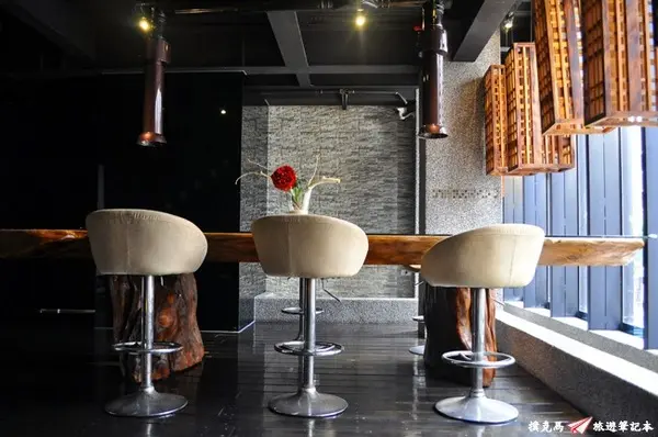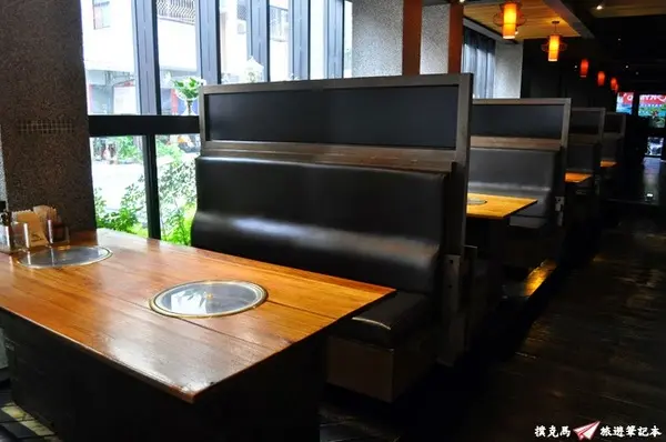 餐廳塑造的氛圍有別於一般的燒烤店,充滿木造流麗的質感,座位安排上,包含了沙發區與吧檯區,而吧檯區的座位屬於單人高凳座椅,背後是「喜」字造型,有趣的是;單人座椅合起來就變成雙人座 椅,背後也就變成「囍」字嘍!