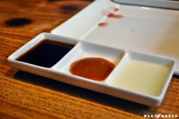 醬料包含甜甜的燒烤醬(左)、帶辣帶鹹的味噌辛醬(中)、帶酸的檸檬醬汁(右)