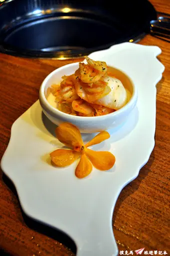 令人相當驚豔的一道料理,不光光只是它的擺盤,帶有水果風味的泡菜,口感清脆,微酸微甜還帶微微的辣,相當開胃!