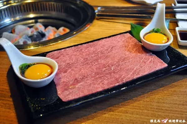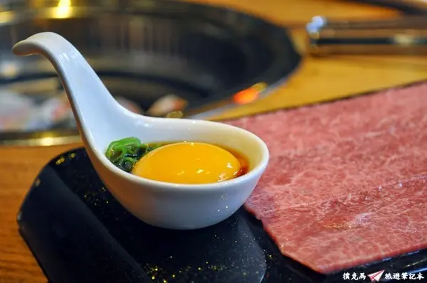 有機雞蛋並非生吞入口,得將蛋黃拌勻之後,待會沾著與牛肉一同入口。由於蛋黃之中使用蔥花及自製醬油調味,因此絲毫沒有任何蛋黃的腥味。