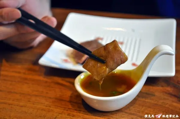 表面薄薄的酥脆感,送入口中,除了咬勁紮實且肉裡帶筋的口感,咀嚼的瞬間油花慢慢從肉裡溢於舌尖的感覺,香氣誘人,也相當引人食欲。不過吃慣重辣的撲克馬,不覺得有任何辣度!