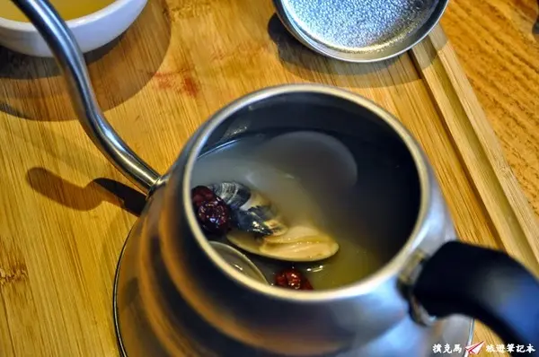 服務人員特別說明這道是中午時段用餐招待的燉湯品,餐廳的湯品特色是使用老母雞長時間熬煮,並僅適度地加入玫瑰鹽做調味,而今日湯品是清味噌紅棗湯。