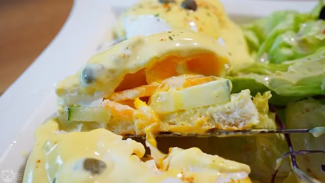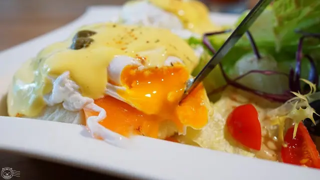 由馬芬麵包、煙燻鮭魚、水波蛋、荷蘭醬跟酸豆組成的斑斑蛋,搭配生菜,算是一般規格。