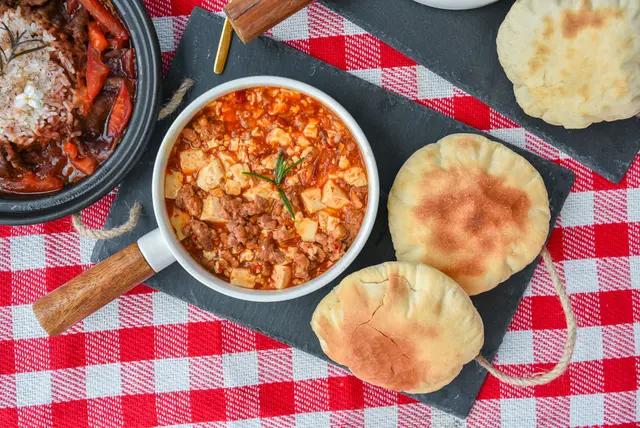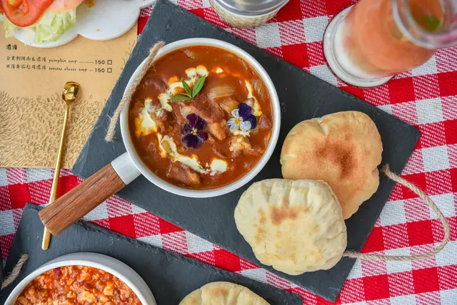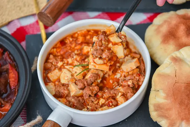 滿滿的豆腐加入豬絞肉燉煮,口味濃郁不死鹹,辣度不高取而代之的是花椒麻香味,手工揉包發酵一小時的酥脆帶點咀嚼感的pita麵包真的很美味!