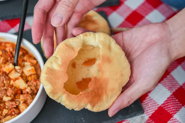 pita餅的表層口感像餅乾一樣酥脆,我們將它敲碎後填入食物後一起吃,pira餅的底層較厚,因此不太會吃得滿手都是~