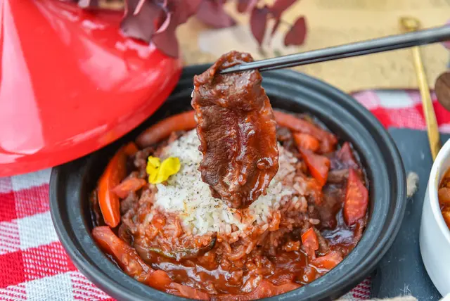 美國雪花牛經過迷迭香、番茄及義大利紅酒燉煮後肉質軟嫩無比帶有牛肉的香氣,牛肉更吸附滿滿的紅酒,每一口都吃的到醬汁的精華,再撒上些紫蘇粉增添風味,而粒粒分明的台灣香米也很好吃!