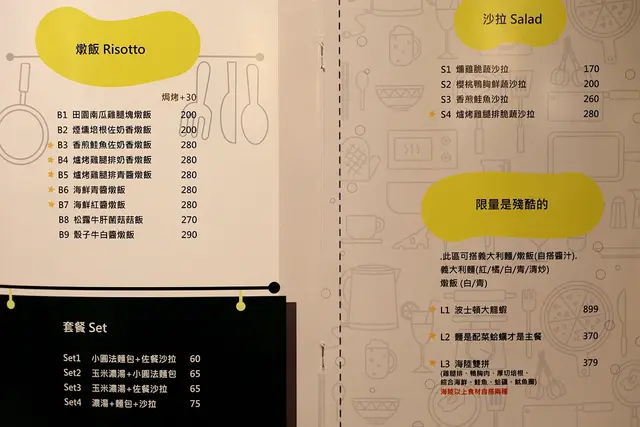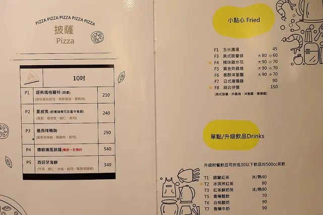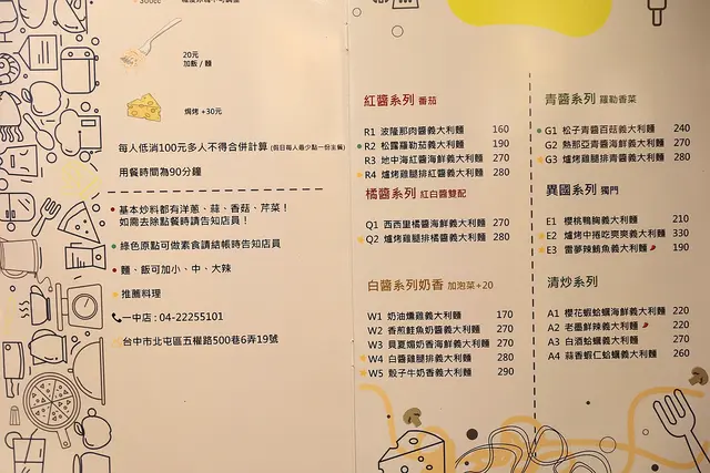 主要提供手工義大利麵、燉飯、及披薩 共三種主餐 還有炸物小點、飲品及沙拉可選擇