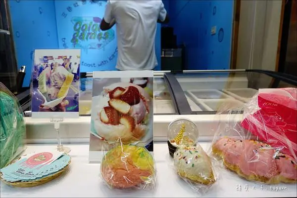 主打以藍色、黃色、粉紅色組成的三色吐司,搭配多種口味的冰淇淋及配料,