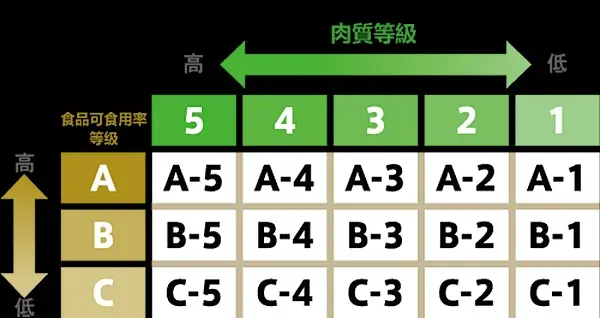 以五項數值「步留等級」、「油花交雜(BMS)」、「肉質組成」、「肉的顏色(BCS)」、「脂肪顏色與質量(BFS)」評級,高到低「A5 ~ C1」共15等級