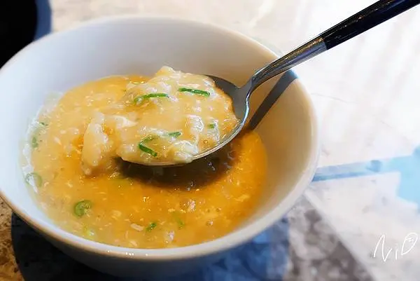 ▲變成一碗帶滿滿金黃蛋花和點綴翠綠青蔥絲的海鮮痛風粥