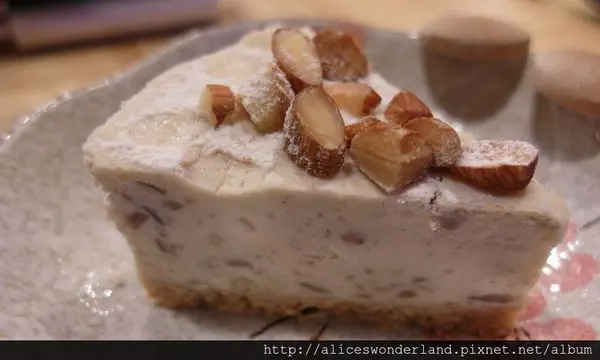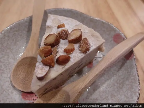 上面擺滿許多的杏仁豆,整體外觀看起來還滿小巧可愛的~(然後這個蛋糕用這個湯池比較適合拉~